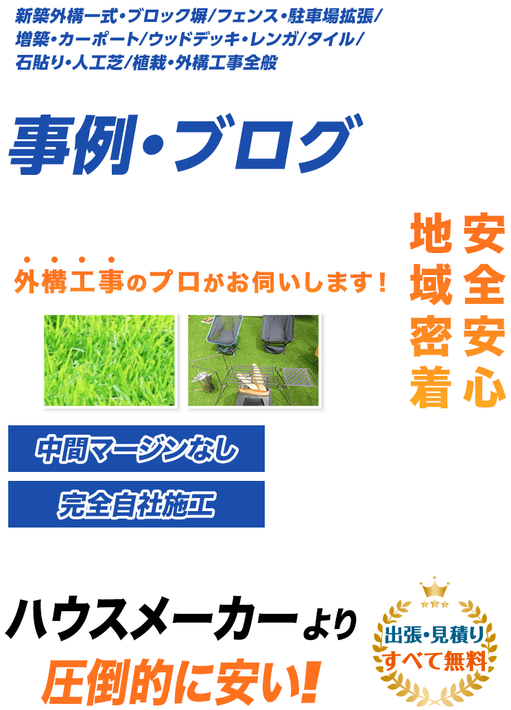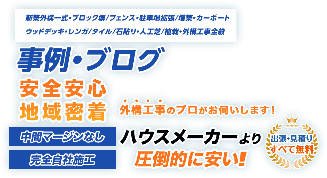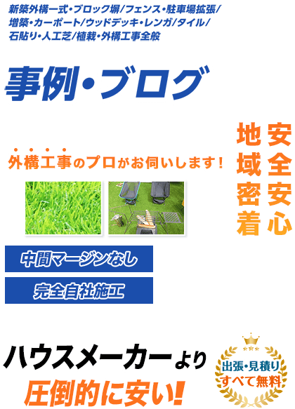フェンス(LIXIL、三協アルミ、YKK AP、タカショー、エクスタイル)、ブロック・レンガ(ユニソン、東洋工業、エスビック)、カーポート(LIXIL ネスカ、三協アルミ スカイリード、YKK AP エフルージュ)、ウッドデッキ(LIXIL 樹ら楽ステージ、YKK AP リウッドデッキ)、門扉・ポスト(LIXIL 開き門扉、ユニソン ヴィコ)